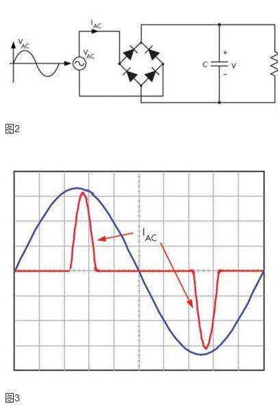 不過(guò),許多電子系統(tǒng)的負(fù)載都需要交流到直流的轉(zhuǎn)換。在這種情況下,典型電源的電源線上的負(fù)載由一個(gè)驅(qū)動(dòng)電容的橋式二極管組成(圖2)。它是電源線的非線性負(fù)載,因?yàn)榇藰蚴秸髌鞯膬蓚(gè)二極管都位于輸入交流電源線電壓的正半周期或負(fù)半周期的直接電源通路中。此非線性負(fù)載僅在正弦電源線電壓的峰值期間汲取電源線電流,這樣會(huì)產(chǎn)生“多峰”輸入電源線電流,從而引起電源線諧波(圖3)。