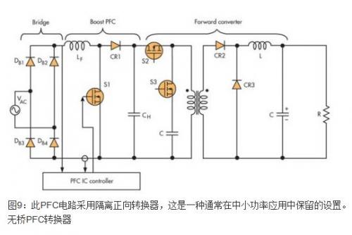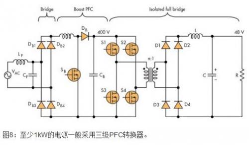 要實(shí)現(xiàn)1kW或1kW以上的功率,設(shè)計(jì)工程師經(jīng)常采用三級(jí)方法(圖8)。在圖8中,標(biāo)準(zhǔn)升壓PFC轉(zhuǎn)換器和隔離降壓轉(zhuǎn)換器位于輸入的橋式整流器之后。這總共需要14個(gè)開(kāi)關(guān)。其中至少六個(gè)開(kāi)關(guān)為高壓開(kāi)關(guān),這樣就進(jìn)一步降低了效率,增加了成本。盡管如此,在使用最好開(kāi)關(guān)器件的情況下,最高效率能夠達(dá)到90%左右,該頻率仍比兩級(jí)方法的效率要高。
