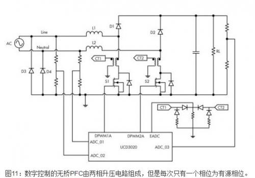 如今的大多數(shù)數(shù)字功率控制器(比如TI的UCD3020)都具有集成式功率控制外設(shè)和功率管理內(nèi)核,包括數(shù)字環(huán)路補(bǔ)償器、快速模數(shù)轉(zhuǎn)換器(ADC)、帶內(nèi)置死區(qū)時(shí)間的高分辨率數(shù)字脈寬調(diào)制器(DPWM)、低功耗微控制器等。這些控制器支持無(wú)橋PFC等復(fù)雜的高性能電源設(shè)計(jì)。