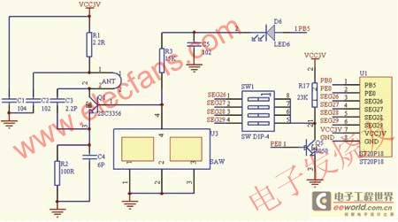 其中單片機采用的是 ST20P18,它是由臺灣矽創(chuàng)公司生產(chǎn)的一種CMOS工藝制造的低功耗低價位的8位單片機,芯片內(nèi)部帶有振蕩器、系統(tǒng)定時器、看門狗定時計數(shù)器、LCD 控制器和16Kb的ROM以及192B的RAM。ST20P18控制的發(fā)碼電路原理圖如圖1所示,其發(fā)碼的基本原理為:系統(tǒng)利用撥碼開關(guān)來控制地址位和數(shù)據(jù)位(二進制)信息的設(shè)置,再通過單片機運行發(fā)碼程序進行編碼并把地址位和數(shù)據(jù)位信息變換成一串脈沖信號,最后由無線發(fā)射電路發(fā)射出去。具體實現(xiàn)為:單片機PB0口為發(fā)碼電路的數(shù)據(jù)輸出口和控制口,當(dāng)需要發(fā)碼的時候該口設(shè)置為輸出口,然后以脈沖的形式,按照相關(guān)的通信協(xié)議,輸出當(dāng)前所要發(fā)出的正確數(shù)據(jù)。反之,PB0口可復(fù)用為其他功能。PB0口的脈沖數(shù)據(jù)經(jīng)發(fā)碼電路調(diào)制并發(fā)射出433MHz的無線電波。