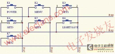由于ST20P18的I/O口有限,故在鍵盤電路中采用掃描的方式來實現(xiàn)。該電路的實現(xiàn)方式如圖2所示。其工作的基本原理是:單片機初始化后先設(shè)置 PA0至PA5、6個I/O口均為輸入方式。以K1為研究對象,先設(shè)置PA0口為高電平,設(shè)置PA5口為低電平,當(dāng)K1按鍵按下后,PA0則由高電平跳變?yōu)榈碗娖,并產(chǎn)生中斷。單片機響應(yīng)該中斷,執(zhí)行中斷服務(wù)程序。同理,其他6個按鍵也是按照該方式工作的。單片機掃描原則是自上而下,自左而右的。