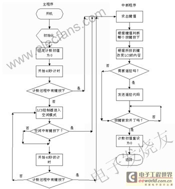 開機后,先進行初始化,包括對單片機的初始化、LCD的初始化和其他模塊的初始化。出于省電的考慮在40s內(nèi)若沒有鍵按下,讓單片機的LCD控制器進入空閑模式。用“for”循環(huán)來計時,并設(shè)計初值為零。隨后開始40s計時,若在此期間有鍵按下,則進入中斷服務(wù)程序,若40s內(nèi)無鍵按下,則單片機的 LCD控制器進入空閑模式。若在空閑中有鍵被按下,單片機被喚醒,執(zhí)行中斷服務(wù)程序。由于單片機的LCD控制器被中斷喚醒執(zhí)行完中斷程序返回后,單片機會接著執(zhí)行把單片機的LCD控制器置為空閑模式的那條指令的下一條指令,因此在把單片機的LCD控制器置為空閑模式的指令后再有一個循環(huán)來計時,由于中斷返回前,重設(shè)計數(shù)初值為零,所以會重新開始5s的計時。在這40s內(nèi),若無鍵按下, 則單片機的LCD控制器又進入空閑模式。程序流程圖如圖4所示。