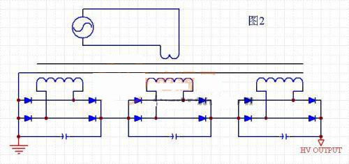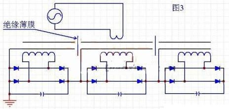 這種方式的電路示意圖如圖3所示。特點是,磁芯是由多段組合而成,每段磁芯之間都用絕緣性能很好的薄膜進(jìn)行絕緣。每段磁芯都有一個次級繞組。優(yōu)點是:適合較大功率的輸出。變壓器數(shù)量少,只需要一副磁芯。每段次級繞組與磁芯的電壓差小,次級繞組對磁芯的絕緣容易處理。缺點是:磁芯是分段的,結(jié)構(gòu)復(fù)雜。磁芯有氣隙,分段越多,等效氣隙越大,磁芯固定困難。