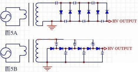 半波多倍壓電路有兩種結(jié)構(gòu),一種是圖5A的結(jié)構(gòu),這是基本的也是最常見的倍壓整流電路了。這種電路的優(yōu)點是:結(jié)構(gòu)簡單,二極管和電容的電壓應(yīng)力都不高,變壓器的輸出電壓也不算高。缺點是:帶負(fù)載能力較差,倍壓階數(shù)越高則電壓跌落越多,最終存在一個極限倍壓階數(shù)。超過這個階數(shù),電壓不再升高,反而會下降。另一種是圖5B的結(jié)構(gòu),這種電路的帶載能力強一些,但是電容的電壓應(yīng)力很高。