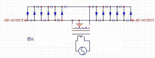 例如抽頭式雙半波可以拓展為抽頭式全波正負(fù)多倍壓電路,用以得到正負(fù)高壓。也可以把圖5B的結(jié)構(gòu)和圖5A的結(jié)構(gòu)混合起來使用。也可以把常規(guī)整流方式與倍壓整流方式混合使用。正負(fù)倍壓方式中,也可以正、負(fù)階數(shù)不一致。很多場合,我們把變壓器和整流電路兩種解決手段同時組合使用,例如變壓器次級分段,每段分別全波倍壓后串聯(lián)輸出等等。