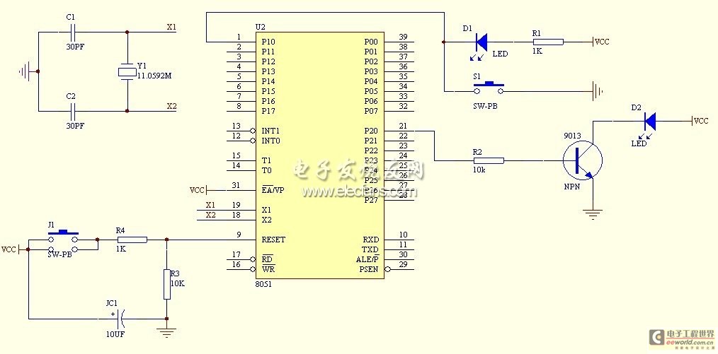 如圖4 所示為系統(tǒng)遙控發(fā)射原理圖,P1.0 口為按鍵輸入口;P2.0 口為紅外發(fā)射端口,用于輸出38kHz 載波編碼,脈沖經(jīng)9013(NPN)放大然后由紅外發(fā)射管輸出;第9 腳為單片機(jī)的復(fù)位腳,采用RC 手動(dòng)復(fù)位電路;18、19 腳接晶振。