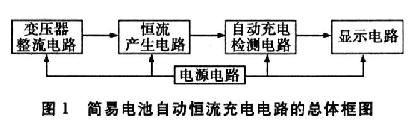 簡易電池自動恒流充電電路的總體框圖如圖1所示。它是由變壓器整流電路、恒流產(chǎn)生電路、自動斷電電路、顯示電路和電源電路5部分構(gòu)成。