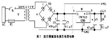 變壓器整流電路和穩(wěn)壓電源電路(如圖2虛線左邊所示),其主要由變壓器、二極管橋式電路、電容構(gòu)成。其中變壓器采用常規(guī)的鐵心變壓器,并將公共電網(wǎng)中的220 V交流電變?yōu)?2 V交流電,再通過二極管橋式電路進(jìn)行整流和電容C1濾波。整流信號由VC1引出。在此基礎(chǔ)上再接三端穩(wěn)壓器CW7812及電容C3、C4(如圖2虛線右邊所示),這樣整個電路就構(gòu)成穩(wěn)壓電源電路。由B點提供+12 V的直流電壓。