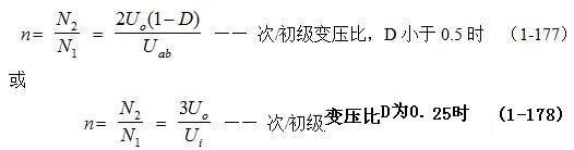 n =N2/N1 =2Uo/Ui = 2Upa/Ui —— 次/初級(jí)變壓比,D = 0.5時(shí) (1-176)