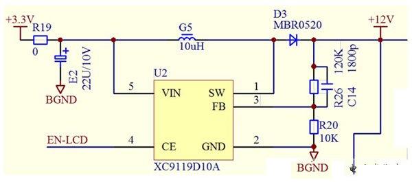 這個芯片把三極管集成到芯片內(nèi)部,因此應用比較簡單。因為它能提供的電流很小,是給lcd供電的。+12V后面還有一個10uF/25V的電容。