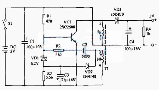 需要說明的是:由于輸入直流電壓低,不需要隔離,同時輸入直流電壓干和輸出直流電壓比較接近,因此高頻變壓器沒有設(shè)次級線圈,負(fù)載電路的能量直接從初級線圈獲取。這樣做有兩點(diǎn)好處:一是提高了電路的轉(zhuǎn)換效率,二是VD3、C4、R4等同時又組成了浪涌電壓吸收回路,吸收VT1截止瞬間產(chǎn)生的反向高壓。