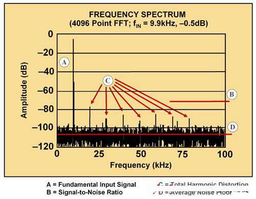 FFT圖中4條規(guī)范包括基本輸入信號、信噪比、總諧波失真和平均噪聲底限。