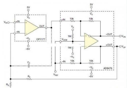 對很多應(yīng)用而言,AD8476內(nèi)置的小功率全差分精密放大器就足夠完成單端-差分的轉(zhuǎn)換功能。但對于需要更高性能的應(yīng)用,可以將一只OP1177精密運(yùn)放與AD8476相級聯(lián),如圖所示。這種單端-差分轉(zhuǎn)換器有高的輸入阻抗、(最大)2nA輸入偏移電流及相對輸入端的(最大)60μV偏移電壓和(最大)0.7μV/℃電壓偏移。