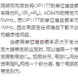 與任何反饋連接相同,必須非常注意確保系統(tǒng)的穩(wěn)定。OP1177與AD8476的級聯(lián)構(gòu)成了一個(gè)組合式差分輸出運(yùn)放,其開環(huán)增益是OP1177開環(huán)增益與AD8476閉環(huán)增益的乘積。因此,AD8476的閉環(huán)帶寬為OP1177的開環(huán)增益加了一極。為確保穩(wěn)定性,AD8476的帶寬應(yīng)高于OP1177的單位增益頻率。當(dāng)電路的閉環(huán)增益大于2時(shí),這個(gè)要求可以放松,因?yàn)殡娮璺答?br />