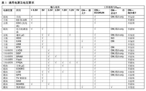 大多數(shù)系統(tǒng)電源的基本架構(gòu)選擇應(yīng)從電源要求以及汽車廠商定義的電池電壓瞬變波形入手。對于電流的要求應(yīng)該反映到電路板的散熱設(shè)計。表1歸納了大多數(shù)設(shè)計的電路及電壓要求。