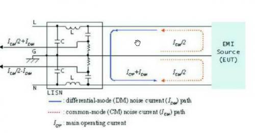 從被測物體的電流路徑來看,干擾信號(hào)回流路徑可能通過地線,或者通過其它電網(wǎng),如圖1所示。通過地線的干擾電流在電源網(wǎng)上產(chǎn)生同相位的共模干擾電壓。通過其它線在兩根電源線上產(chǎn)生反相的差模干擾電壓。干擾電流的路徑如圖2所示。