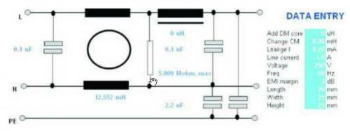 知道設(shè)備的干擾特性和輸入阻抗特性后,設(shè)計(jì)或者選擇一個(gè)濾波器就變得簡單了。如果使用一個(gè)現(xiàn)成的濾波器,可以調(diào)用過去積累的濾波器數(shù)據(jù)庫,比對(duì)濾波器參數(shù),找到一個(gè)合適的濾波器。如果沒有合適的或者想專門設(shè)計(jì)一個(gè)專用濾波器,可以借助專用的濾波器設(shè)計(jì)軟件。在確定一個(gè)濾波器模式后輸入濾波器一些簡單的約束條件,設(shè)計(jì)軟件根據(jù)阻抗特性自動(dòng)計(jì)算出最合適的組件值,以及提供最合適的衰減。(如圖6所示)