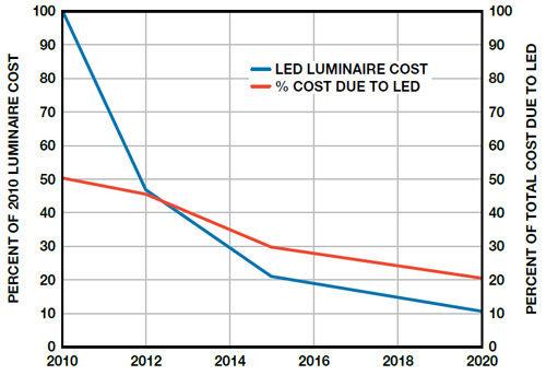 憑借使用壽命長和功耗低的優(yōu)勢,LED有望改變整個照明行業(yè),但它的快速采用面臨的主要障礙是LED本身的成本居高不下。LED燈具(完整電力照明設備)的成本各不相同,但LED的成本通常占據(jù)了整個燈具成本的大約25%至40%,而且預期在今后多年內(nèi)仍會占據(jù)很高比例(圖1)。