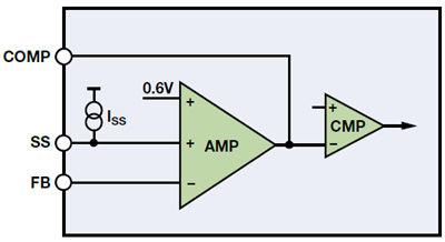 很多通用降壓IC包括軟啟動(SS)或跟蹤(TRK)引腳。SS引腳可緩慢增加啟動時的開關(guān)占空比,從而最大程度地減小啟動瞬變。TRK引腳讓降壓穩(wěn)壓器能夠遵循獨立電壓。這些功能通常結(jié)合到單個SS/TRK引腳上。大多數(shù)情況下,誤差放大器將SS、TRK和FB電壓中的最小值與基準進行比較,如圖6所示。