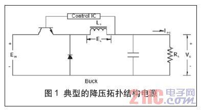 圖1所示為一個降壓拓撲結(jié)構(gòu)開關(guān)電源的架構(gòu),該構(gòu)架廣泛應(yīng)用于輸出電壓小于輸入電壓的開關(guān)電源系統(tǒng)。在典型的降壓拓撲結(jié)構(gòu)電路中,當開關(guān)(Q1)閉合時,電流開始通過這個開關(guān)流向輸出端,并以某一速率穩(wěn)步增大,增加速率取決于電路電感。根據(jù)楞次定律,di=E*dt/L,流過電感器的電流所發(fā)生的變化量等于電壓乘以時間變化量,再除以這個電感值。由于流過負載電阻RL的電流穩(wěn)定增加,輸出電壓成正比增大。
