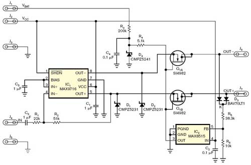 汽車電子產(chǎn)品的一個(gè)普遍要求是直接連接到配線裝置,必須能夠經(jīng)得起電池電壓的短路。雖然殘酷,但這項(xiàng)規(guī)定對(duì)可靠性與安全來(lái)說是必要的。一個(gè)需要這種保護(hù)的例子是用于汽車內(nèi)部產(chǎn)生間接噪聲的音頻放大器。雖然工作電壓為3.3或5v,低于電池電壓,但放大器必須能夠忍受滿電池電壓。還可以使用適合其他汽車電路中放大器的保護(hù)網(wǎng)絡(luò) (圖1)。一個(gè)雙N溝道場(chǎng)效應(yīng)管隔離從接線結(jié)點(diǎn)到另一端的高壓條件的放大器輸出。該場(chǎng)效應(yīng)管,Q1A 和Q1B,通常情況下是開著的;齊納擊穿二極管D4及其偏置元件驅(qū)動(dòng)場(chǎng)效應(yīng)管的門限大約達(dá)到11V。雙二極管D3提供OR二極管連接到每個(gè)輸出的直流電壓,從而產(chǎn)生電壓控制分流調(diào)節(jié)器IC2的輸出。電路保護(hù)IC1,1.4W的AB類放大器適于為汽車電子提供聲音警告和指示。