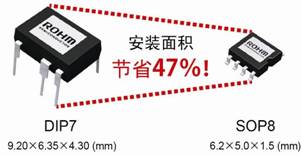 AC/DC一般多采用平面型MOSFET,因散熱問題而較難實現(xiàn)小型化。此次,羅姆采用了自產(chǎn)的超級結(jié)MOSFET。通過內(nèi)置多種保護功能減少了外置部件數(shù)量。8W級別以下的產(chǎn)品,除了標準的DIP7封裝,又新增了可表面貼裝的SOP-8封裝產(chǎn)品。采用SOP-8封裝(6.2mm×5.0mm×1.5mm)產(chǎn)品,安裝面積可節(jié)省47%,不僅能使配套產(chǎn)品更加小巧,而且設(shè)計和基板布局也更加簡單。