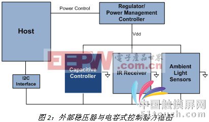 在這些應(yīng)用中,主機(jī)控制器負(fù)責(zé)控制一個(gè)外部穩(wěn)壓器或電源管理集成電路(PMIC),通過外部穩(wěn)壓器或PMIC來控制和調(diào)整電容式控制器及其他設(shè)備的電源。下圖2給出了典型的實(shí)施方框圖!