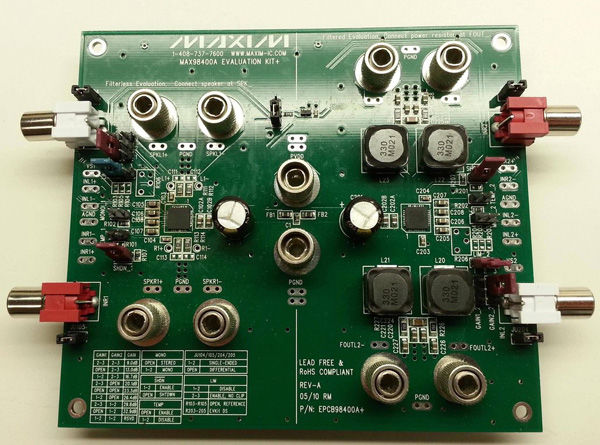 圖1. 整個項目從MAX98400A開始。評估板上有兩個40W放大器,我計劃設(shè)計的音箱聲音會很響亮。
