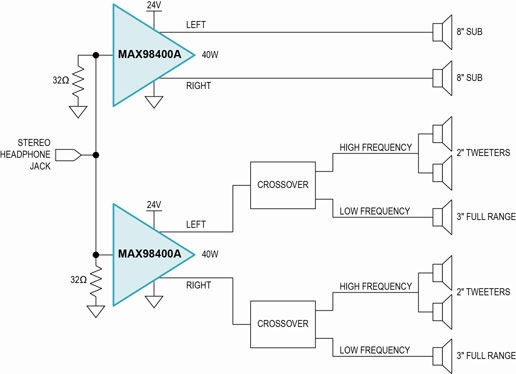 圖2. 在手提音箱中采用兩個MAX98400A放大器的揚聲器元件原理圖。一個放大器專用于推動大8in揚聲器,另一個放大器通過交叉點開關(guān)推動兩個2in高音揚聲器和一個3in全頻揚聲器。