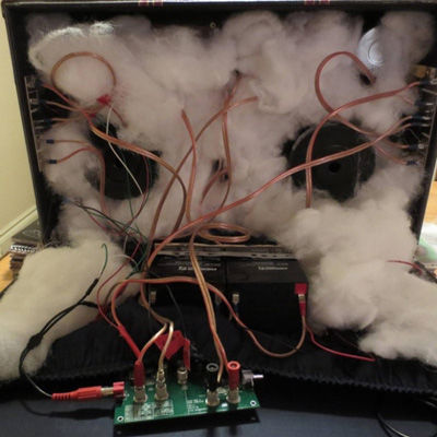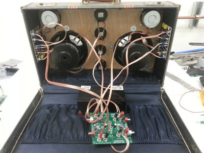 圖3. 我使用規(guī)格為12的音頻線(據(jù)我所知,這很穩(wěn)固)和香蕉插孔將揚聲器連接至電路板。然后將交叉點開關(guān)用膠水粘在手提音箱壁上。