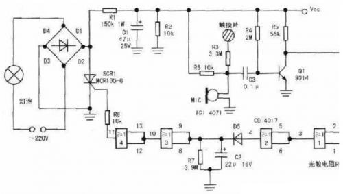 下圖是聲、光、觸摸三控延時自熄開關(guān)的電氣原理圖,該電路由電源電路、信號檢測轉(zhuǎn)換電路、延時電路和控制電路組成。