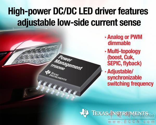 TI宣布推出一款支持可調(diào)節(jié)開關頻率與電流感應閥值的大功率多拓撲 DC/DC LED 驅(qū)動器,其可為汽車前大燈、霧燈以及通用照明提供設計高靈活性與低電磁干擾 (EMI)。該 TPS92690 是一款配備低側(cè)電流感應的 N 通道 MOSFET 控制器,支持升壓或升降壓(SEPIC、Cuk、反激)LED 驅(qū)動器拓撲。