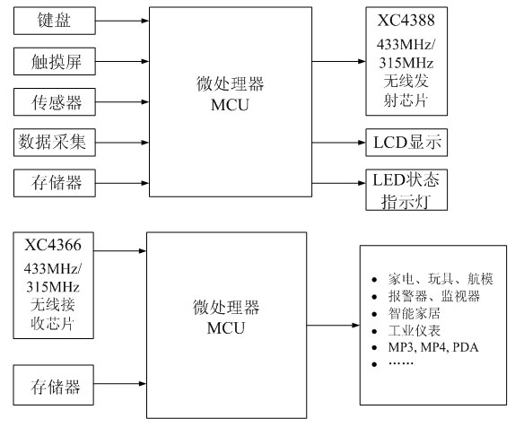 基于深圳市黌軟電子有限公司的XC4388/XC4366系列無線收發(fā)芯片設(shè)計(jì)的一款完整的、低功耗、低成本的無線收發(fā)解決方案。主要設(shè)定為315MHz/433MHz頻段,有效距離可達(dá)100米?梢愿鶕(jù)客戶具體的產(chǎn)品需求,靈活進(jìn)行全定制的模塊設(shè)計(jì),極大地縮短終端產(chǎn)品的開發(fā)周期。