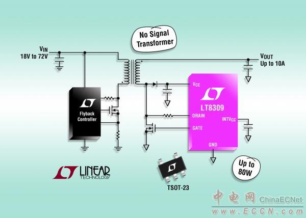 Linear推出反激式副邊同步整流器驅(qū)動(dòng)器 LT8309,該器件采用 MOSFET 取代了輸出二極管,無需使用散熱器就可允許高達(dá) 10A 的輸出電流。在不使用散熱器時(shí),反激式電源的最大輸出電流受到功耗和輸出二極管產(chǎn)生的熱量所限制。LT8309 用外部 N 溝道 MOSFET 的 RDS(ON) 壓降取代了二極管的正向壓降,因此降低了功耗、提高了轉(zhuǎn)換器的效率并減輕了熱設(shè)計(jì)的負(fù)擔(dān)。