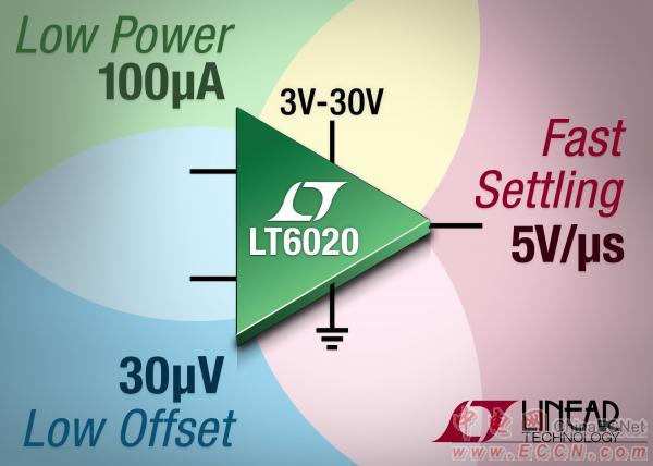Linear推出 3V 至 30V 快速穩(wěn)定雙路運(yùn)算放大器 LT6020,該器件具備 30µV 最高輸入失調(diào)電壓和 0.5µV/°C 最大 VOS 漂移。雖然每個(gè)放大器的電源電流只有 100µA (最大值),但專有的擺率增強(qiáng)電路可提供快速干凈的輸出階躍響應(yīng)。不管輸出階躍是 5V 還是 25V,LT6020 都能在不到 15µs 的時(shí)間里穩(wěn)定至 0.0015%。特別設(shè)計(jì)的輸入電路維持了高阻抗,從而最大限度地抑制了由于快速階躍而引起的電壓尖峰 (針對(duì)高達(dá) 5V 的輸入階躍)。所有這些特性使得 LT6020 非常適合于高精度多路復(fù)用數(shù)據(jù)采集系統(tǒng)、DAC 緩沖器應(yīng)用和便攜式高精密儀器。