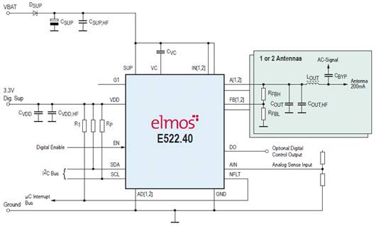 德國多特蒙德,艾爾默斯公司(elmos)日前宣布推出一種緊湊型封裝的汽車級雙天線電源保護(hù)芯片。該芯片為天線系統(tǒng)提供靜電保護(hù)(ESD保護(hù))以及電源對地/電池的短路保護(hù),同時(shí)該芯片具備過熱保護(hù)的功能。通過I2C總線接口,可以非常方便的通過兩根數(shù)據(jù)線對多個(gè)不同的器件進(jìn)行尋址。該芯片采用QFN20L5封裝。