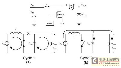 2)減小諧波回路面積,對 LM3478,如圖,MOS 管開通時(shí),Cin,L 和 MOS 構(gòu)成一個(gè)回路對電感充電,請看圖 2(a)的 Cycle1。MOS 管關(guān)斷時(shí),Cin,L,D,Cout 構(gòu)成另一個(gè)回路對電感放電,請看圖 2(b)中的 Cycle2。對于二極管 D,交替工作在正向?qū)ê头聪蚪刂沟臓顟B(tài),因此,有很高的反向恢復(fù)尖峰電壓,需要在二極管兩端加 Snubber 電路來抑制這個(gè)尖峰電壓,以避免產(chǎn)生過大的共模噪聲。這兩個(gè)回路的工作頻率是 MOS 的開關(guān)頻率,諧波分量大,布板時(shí)要盡量減小諧波回路的面積。要把這兩個(gè)功率回路的器件靠近放置,走大銅皮寬走線,減小開關(guān)頻率諧波的回路阻抗。