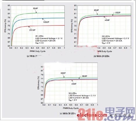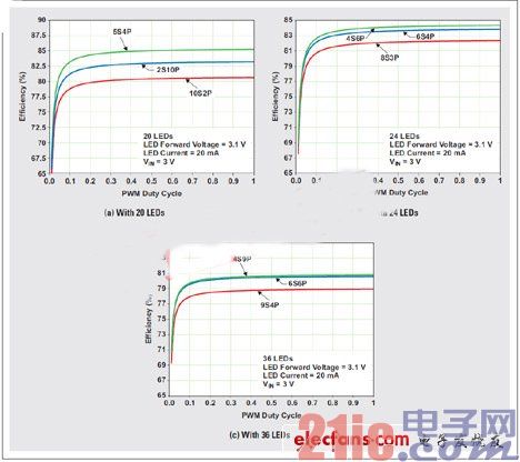 通過選擇串的最佳數(shù)目以及每串LED的最佳數(shù)目,來最小化功耗和最大化電池使用時間,是一項(xiàng)具有挑戰(zhàn)性的工作。使用更少的串,要求每串有更多的LED,并且會導(dǎo)致升壓轉(zhuǎn)換器更高的輸出電壓。升壓轉(zhuǎn)換器輸入和輸出電壓之間的差異越大,其效率也就越低。另外,更多的串會導(dǎo)致更高的總輸出電流,以及更高的電感和升壓整流二極管損耗。圖3顯示了不同串聯(lián)(S)和并聯(lián)(P)組合時三種不同LED配置的模擬升壓功率級效率。使用更多的串,可讓每串的LED更少,并提供更低的輸出電壓,但它要求更多的電流阱,不得不消耗更多的功率,從而降低驅(qū)動器的總效率。