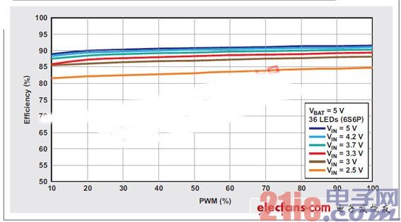 根據(jù)前面的分析,具有集成電流阱的背光驅(qū)動器,例如:德州儀器TPS61181A筆記本電腦背光驅(qū)動器,可以針對平板電腦背光進(jìn)行優(yōu)化(參見圖5)。對于那些使用兩節(jié)鋰離子電池的平板電腦而言,驅(qū)動器和升壓功率級都可以直接通過電池供電。而對于那些只使用單節(jié)鋰離子電池的平板電腦來說,驅(qū)動器偏壓軌可以由面板的AVDD軌或者系統(tǒng)的另一個電源(4.5V 或者更高)來供電。由于TPS61181A能夠提供比大多數(shù)平板電腦要求的功率稍微更高一些的功率(也就是說,功率FET稍微過大,因此RDS(on)非常低),所以相比專為該輸出功率而設(shè)計(jì)的轉(zhuǎn)換器,這種轉(zhuǎn)換器的功耗更低,從而進(jìn)一步最大化了效率。圖6顯示了6S6P配置TPS61161A的測得效率結(jié)果。