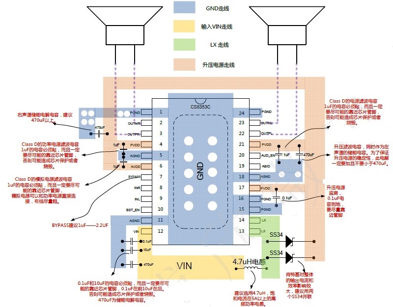 D、升壓輸出的走線也要盡可能粗,(圖中淡粉色部分),功放的供電都由這根線完成。為保證升壓電源的穩(wěn)定性,470uF的電解電容是必須的,盡可能靠近肖特基,同時(shí)可作為左聲道的儲(chǔ)能電容;