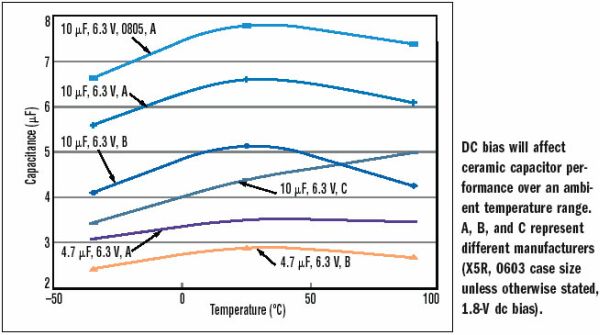 因此,請記住應該向廠商索取在應用的預定直流偏置電壓下的電容值曲線。例如,采用2.5V輸出電壓時,系統(tǒng)設計人員必須查看2.5V時的直流偏置。使開關穩(wěn)定性最好的最小電容值可在開關的規(guī)格說明書中查到。在確定用于便攜式電源解決方案材料清單(BOM)的電容雙重來源時,廠商間的差異也必須考慮到。