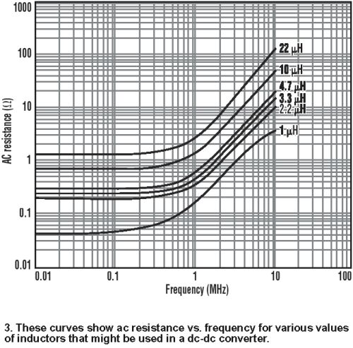 圖3給出了各種電感的交流阻抗與頻率的關系?紤]一個降壓轉換器的例子,其規(guī)格參數(shù)如下:FSW=2MHz,VIN=5.5V,L=2.2 μH,VOUT=1.5V,I=0 到600MA,ΔI=289MA (計算值)。