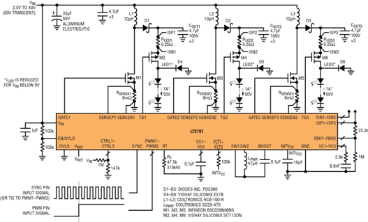 LT3797 是一款三路輸出 LED 驅(qū)動器控制器 IC,其可用于以多種拓撲 (包括升壓、降壓、降壓-升壓和 SEPIC) 為三個 LED 燈串提供電流。每個通道的運作獨立于其他的通道,但它們共用時鐘相位。LED 電流、開路 LED 保護、模擬和 PWM 調(diào)光控制功能電路可以單獨地進行操控。