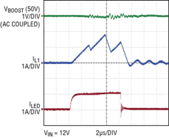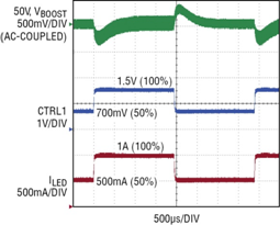 圖 3:從 50% (500mA) 至 100% (1A) 全標(biāo)度電流的模擬調(diào)光瞬變顯示出了降壓模式的高帶寬 (即使當(dāng)升壓級以其自己的常規(guī)速度恢復(fù)時也不例外)。