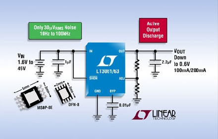 LT3061 具備 1.6V 至 45V 的寬輸入電壓范圍,提供 0.6V 至 19V 的可調(diào)輸出電壓。單個電容器實現(xiàn)可編程超低噪聲工作、在 10Hz 至 100kHz 帶寬上噪聲僅為 30µVRMS 并提供基準軟啟動功能,從而防止輸出電壓在接通時過沖。LT3061 在整個電壓、負載和溫度范圍內(nèi)提供了高度準確的 ±2% 輸出電壓容差。該器件的寬輸入和輸出電壓范圍、快速瞬態(tài)響應、45µA (工作時) 和 <2µA (停機時) 的低靜態(tài)電流使其非常適合于需要最佳運行時間的便攜式電池供電型系統(tǒng)、以及用于汽車、工業(yè)和航空電子電源應用。