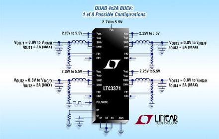 Linear推出高度集成的通用型電源管理解決方案 LTC3371,以用于需要多個低壓電源的系統(tǒng)。該器件具有四個同步降壓型轉(zhuǎn)換器,各由獨立的 2.25V 至 5.5V 輸入供電,而且均可通過配置以共享 8 個可用 1A 功率級中的最多 4 個。利用 8 種獨特的輸出電流配置,LTC3371提供了實質(zhì)的靈活性以及容易重復(fù)使用于不同應(yīng)用中。該器件是多種多通道工業(yè)、汽車、通信和分布式電源系統(tǒng)的理想選擇。