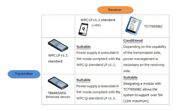 新推出的接收器集成電路TC7765WBG通過將輸出電壓從5V/1A增加到7-12V/1A,提高了功率。發(fā)射器集成電路TB6865AFG增強(qiáng)版使基于經(jīng)過改進(jìn)的外部電路配置和新軟件的10瓦特級(jí)無線解決方案成為現(xiàn)實(shí)。