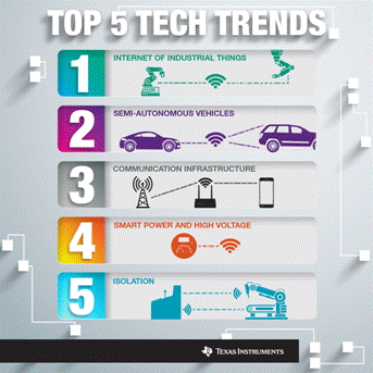 在迎接2015到來之際,我們有必要花時間來評估和預(yù)測未來的一年中將會出現(xiàn)的技術(shù)挑戰(zhàn)和突破創(chuàng)新。通過與眾多戰(zhàn)略客戶、大學(xué)合作伙伴以及TI產(chǎn)品線的技術(shù)專家進(jìn)行探討后,我們認(rèn)為TI將在一些重要技術(shù)趨勢中發(fā)揮戰(zhàn)略性作用。這些技術(shù)趨勢正推動著汽車和工業(yè)等多個市場的發(fā)展,而在此過程中,TI的工程師將幫助應(yīng)對半導(dǎo)體技術(shù)領(lǐng)域的獨特挑戰(zhàn),并利用先進(jìn)技術(shù)改善我們的生活。