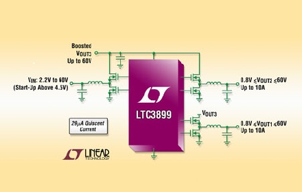 Linear推出三輸出 (降壓、降壓、升壓) 29µA 靜態(tài)電流、同步 DC/DC 控制器  LTC3899,該器件在 2.2V 至 60V 輸入范圍內(nèi)保持輸出電壓穩(wěn)定。12V 汽車電池在引擎重新啟動(dòng)或冷車發(fā)動(dòng)時(shí)可能降至低于 4V,從而導(dǎo)致信息娛樂系統(tǒng)以及其他采用 5V 或更高電壓工作的電子系統(tǒng)復(fù)位。升壓型轉(zhuǎn)換器為兩個(gè)降壓型轉(zhuǎn)換器供電,從而在汽車電池電壓下降時(shí)避免了輸出電壓下降,在怠速時(shí)關(guān)閉引擎以節(jié)省燃料的汽車啟/停系統(tǒng)中,這是一種非常有用的功能。60V 最高輸入電壓涵蓋雙電池卡車應(yīng)用;蛘,降壓型控制器可由輸入供電以用作通用的三路輸出控制器。