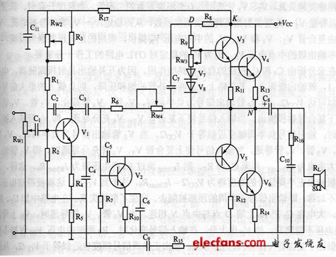 推動級由V2管,R6,RW4,R7,R8,R9,V7管,V8管,RW3,R10,C5,C6,C7組成,連接成共發(fā)射極分壓式偏置穩(wěn)定電路。它承擔向功率輸出級提供足夠的推動電流的任務。推動級功率輸出級采用直接耦合方式。